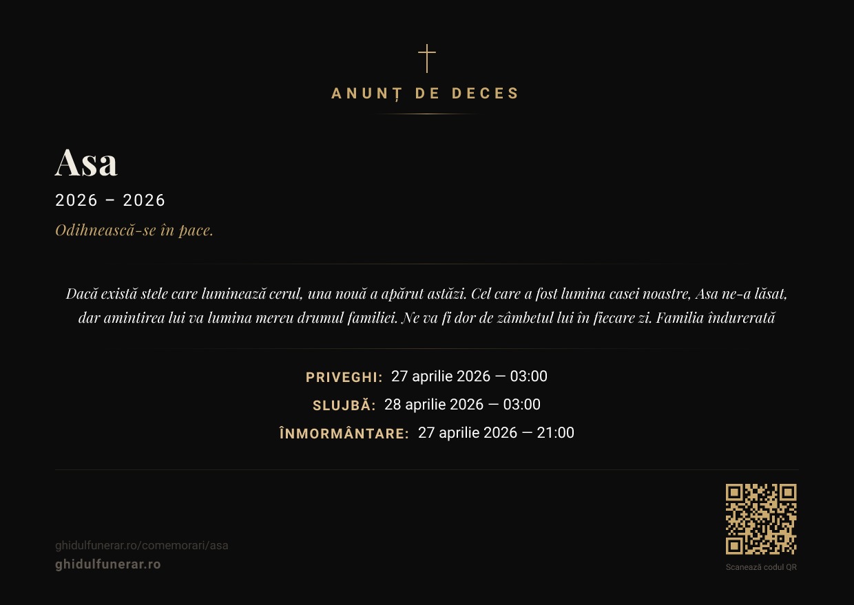 Dacă există stele care luminează cerul, una nouă a apărut astăzi. Cel care a fost lumina casei noastre, Asa ne-a lăsat, dar amintirea lui va lumina mereu drumul familiei. Ne va fi dor de zâmbetul lui în fiecare zi. Familia îndurerată
