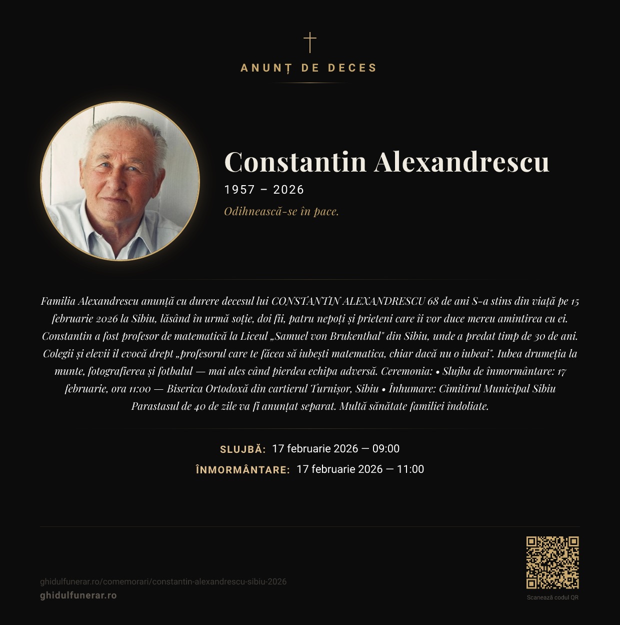 Familia Alexandrescu anunță cu durere decesul lui CONSTANTIN ALEXANDRESCU 68 de ani S-a stins din viață pe 15 februarie 2026 la Sibiu, lăsând în urmă soție, doi fii, patru nepoți și prieteni care îi vor duce mereu amintirea cu ei. Constantin a fost profesor de matematică la Liceul „Samuel von Brukenthal" din Sibiu, unde a predat timp de 30 de ani. Colegii și elevii îl evocă drept „profesorul care te făcea să iubești matematica, chiar dacă nu o iubeai". Iubea drumeția la munte, fotografierea și fotbalul — mai ales când pierdea echipa adversă. Ceremonia: • Slujba de înmormântare: 17 februarie, ora 11:00 — Biserica Ortodoxă din cartierul Turnișor, Sibiu • Înhumare: Cimitirul Municipal Sibiu Parastasul de 40 de zile va fi anunțat separat. Multă sănătate familiei îndoliate.