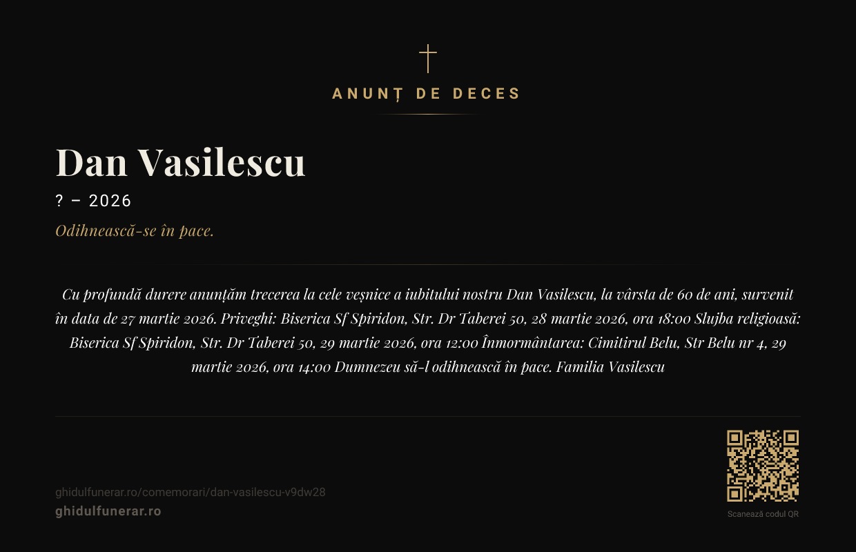 Cu profundă durere anunțăm trecerea la cele veșnice a iubitului nostru Dan Vasilescu, la vârsta de 60 de ani, survenit în data de 27 martie 2026. Priveghi: Biserica Sf Spiridon, Str. Dr Taberei 50, 28 martie 2026, ora 18:00 Slujba religioasă: Biserica Sf Spiridon, Str. Dr Taberei 50, 29 martie 2026, ora 12:00 Înmormântarea: Cimitirul Belu, Str Belu nr 4, 29 martie 2026, ora 14:00 Dumnezeu să-l odihnească în pace. Familia Vasilescu