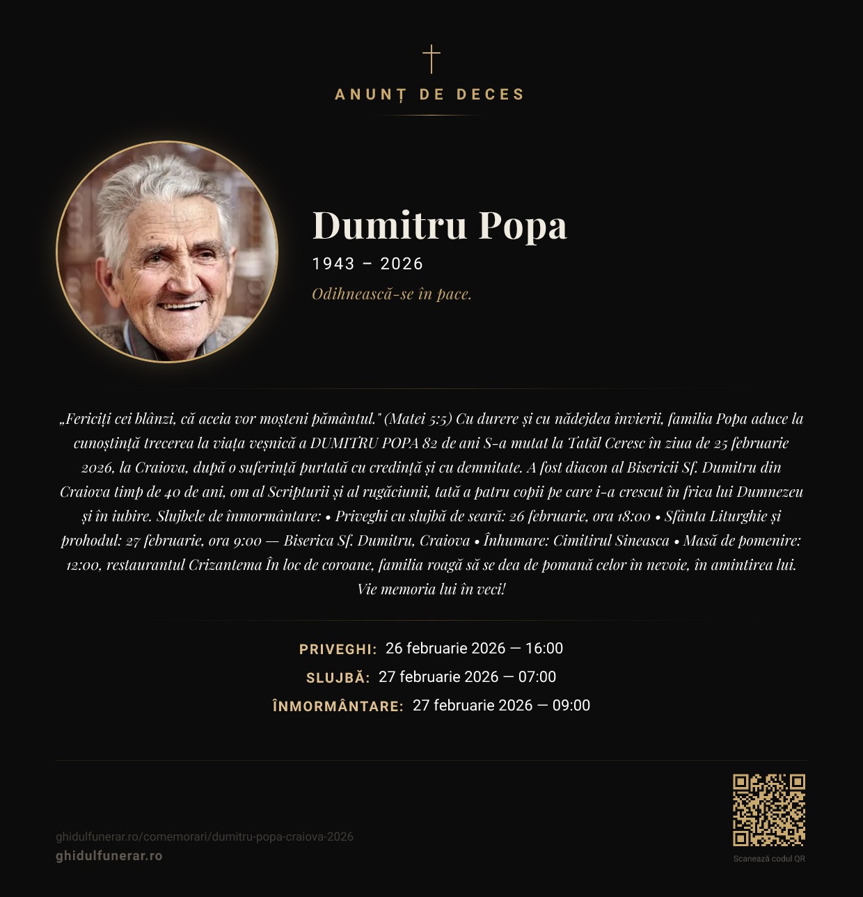 „Fericiți cei blânzi, că aceia vor moșteni pământul." (Matei 5:5) Cu durere și cu nădejdea învierii, familia Popa aduce la cunoștință trecerea la viața veșnică a DUMITRU POPA 82 de ani S-a mutat la Tatăl Ceresc în ziua de 25 februarie 2026, la Craiova, după o suferință purtată cu credință și cu demnitate. A fost diacon al Bisericii Sf. Dumitru din Craiova timp de 40 de ani, om al Scripturii și al rugăciunii, tată a patru copii pe care i-a crescut în frica lui Dumnezeu și în iubire. Slujbele de înmormântare: • Priveghi cu slujbă de seară: 26 februarie, ora 18:00 • Sfânta Liturghie și prohodul: 27 februarie, ora 9:00 — Biserica Sf. Dumitru, Craiova • Înhumare: Cimitirul Sineasca • Masă de pomenire: 12:00, restaurantul Crizantema În loc de coroane, familia roagă să se dea de pomană celor în nevoie, în amintirea lui. Vie memoria lui în veci!