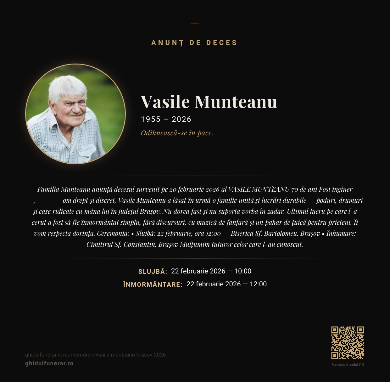 Familia Munteanu anunță decesul survenit pe 20 februarie 2026 al VASILE MUNTEANU 70 de ani Fost inginer constructor, om drept și discret, Vasile Munteanu a lăsat în urmă o familie unită și lucrări durabile — poduri, drumuri și case ridicate cu mâna lui în județul Brașov. Nu dorea fast și nu suporta vorba în zadar. Ultimul lucru pe care l-a cerut a fost să fie înmormântat simplu, fără discursuri, cu muzică de fanfară și un pahar de țuică pentru prieteni. Îi vom respecta dorința. Ceremonia: • Slujbă: 22 februarie, ora 12:00 — Biserica Sf. Bartolomeu, Brașov • Înhumare: Cimitirul Sf. Constantin, Brașov Mulțumim tuturor celor care l-au cunoscut.